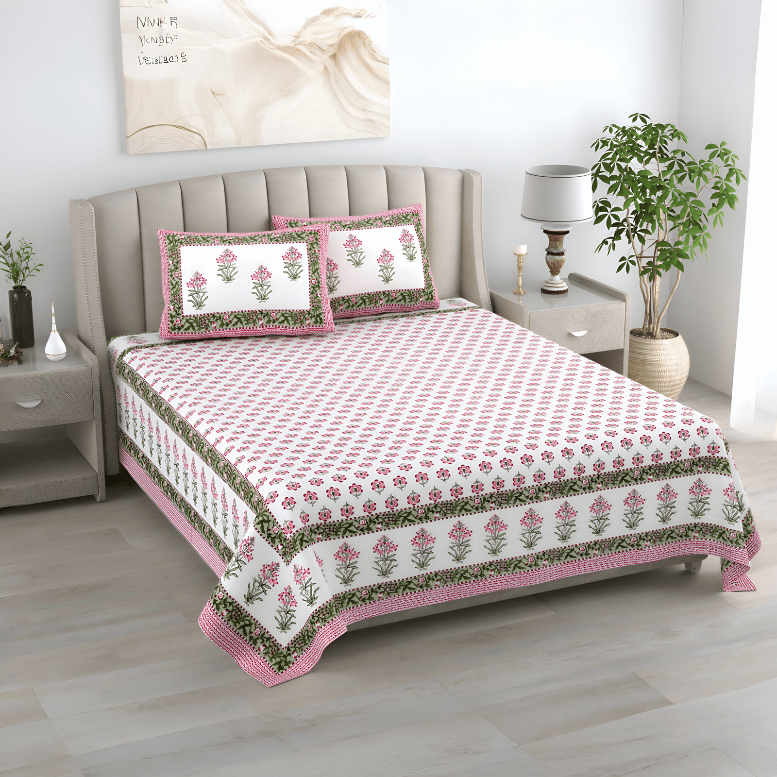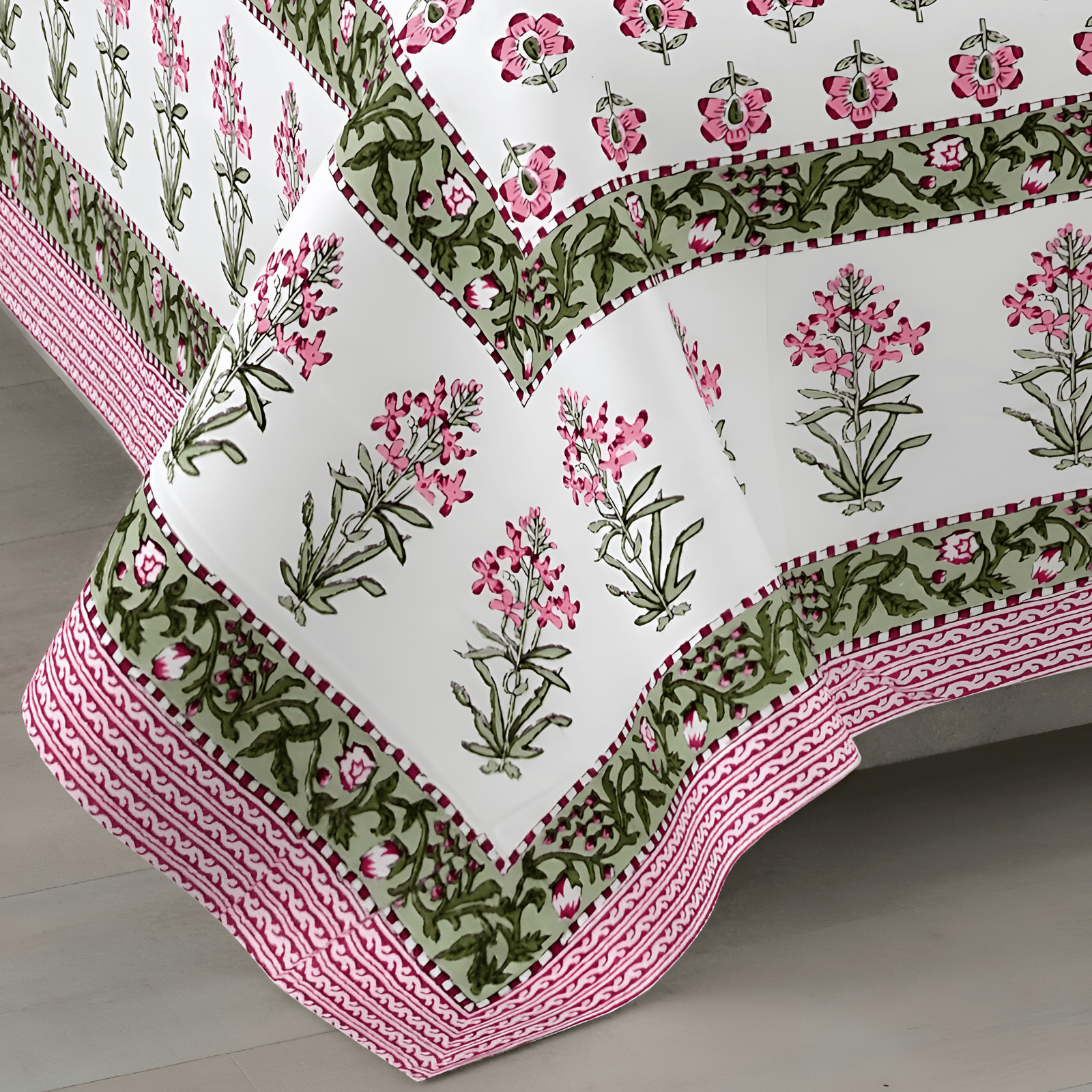 The Pink Blossom Bloom bedsheet features intricate pink floral motifs beautifully aligned along the borders, enhanced by a lush green vine design and finished with a finely crafted pink patterned edge. The hand-block-style floral prints are rich in detail, giving your bed an artisanal and vibrant look.